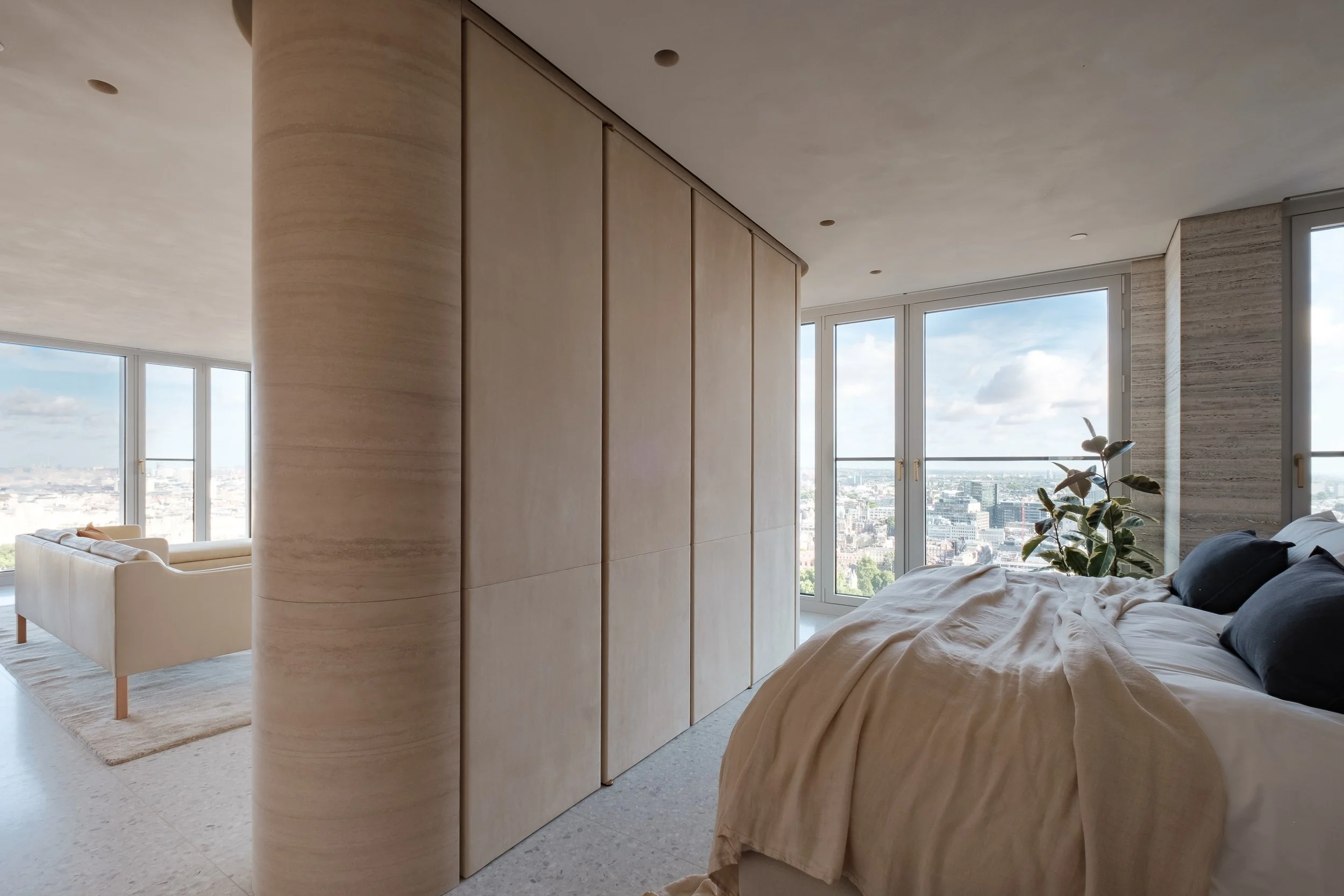 Originally constructed in 1972 Southbank Tower is a landmark building situated adjacent to the River Thames near to Blackfriars Bridge. In 2011 Southbank Tower underwent a change of use including 11-storey extension creating luxurious residential apartments with far-reaching views over the city skyline. The apartment was stripped back to shell, set out and surveyed for final wall penetrations, allowing for the designed interior to be reformed to uncompromising standards. Almost everything in this high specification project has been designed and will be custom made, right down to the door handles and floor boxes. A material palette comprising generous planes of honed travertine, with even the kitchen and bathrooms to be formed in travertine, giving the project a quarried feel. Leather panelling, polished plaster surfaces and fine joinery complement elsewhere. A custom designed & made terrazzo is to be used exclusively across all floor areas to tie the various spaces and elements together. Cabinetry consists of maple units, pear veneered doors and brass and bronze ironmongery. The kitchen is equipped with Vola kitchen fixtures and Miele equipment. High-specification AV and amenities feature significantly. The project also benefits from underfloor heating throughout, with solar and blackout blinds for the full-height windows, which offer panoramic views from Westminster to St Paul’s and the City of London.